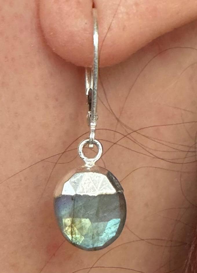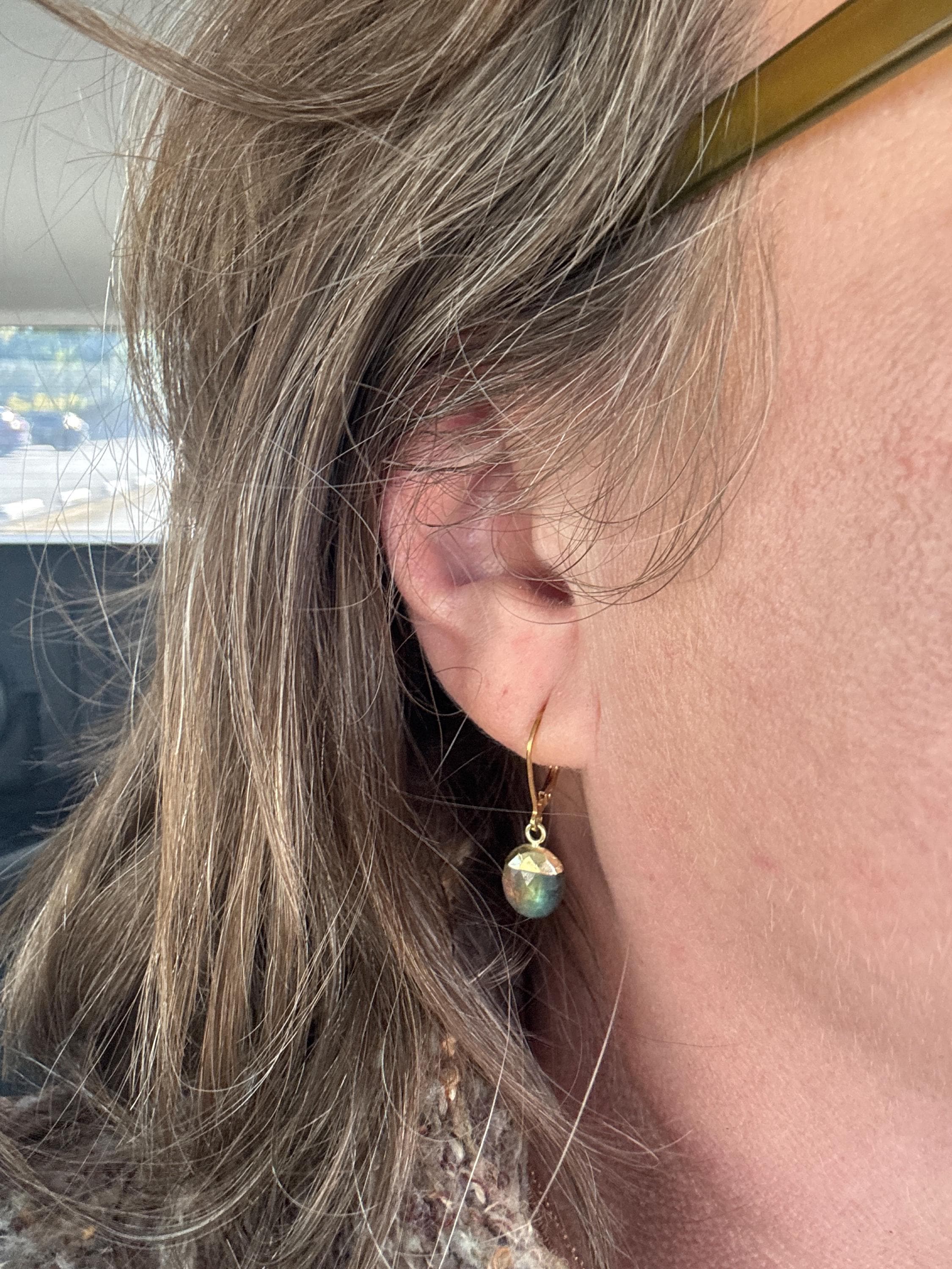 These earrings feature a pair of gold plated faceted labradorite ovals, which hang from your choice of 14k gold filled leverbacks or french wires. These are also available in silver plated drops and sterling silver ear wires.