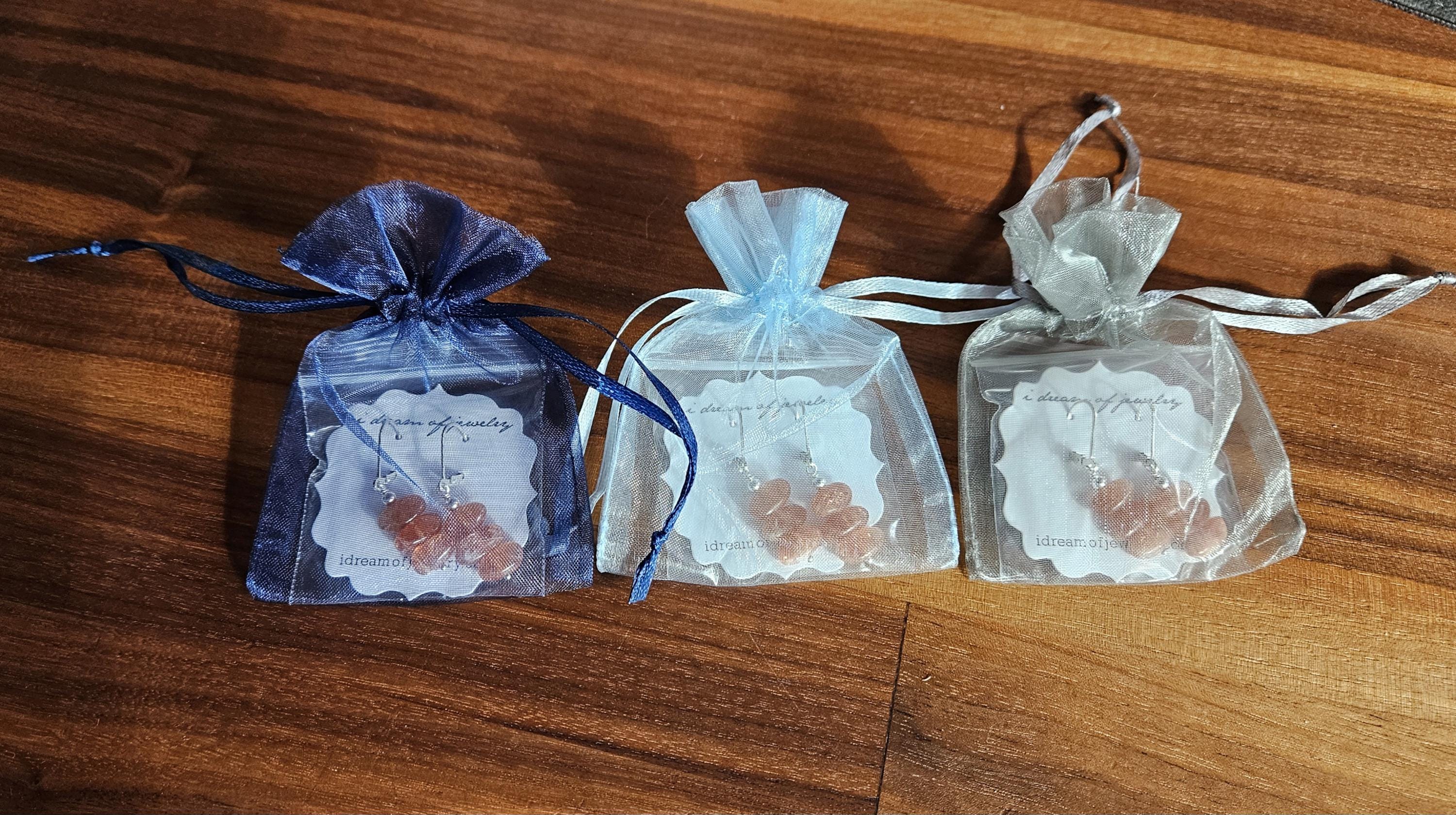 These earrings will arrive in a small zip lock bag, as well as a decorative organza bag. It is recommended that the earrings are kept in the bag when not being worn to keep them nice and shiny. Of course, a quick polish will always work too :-)